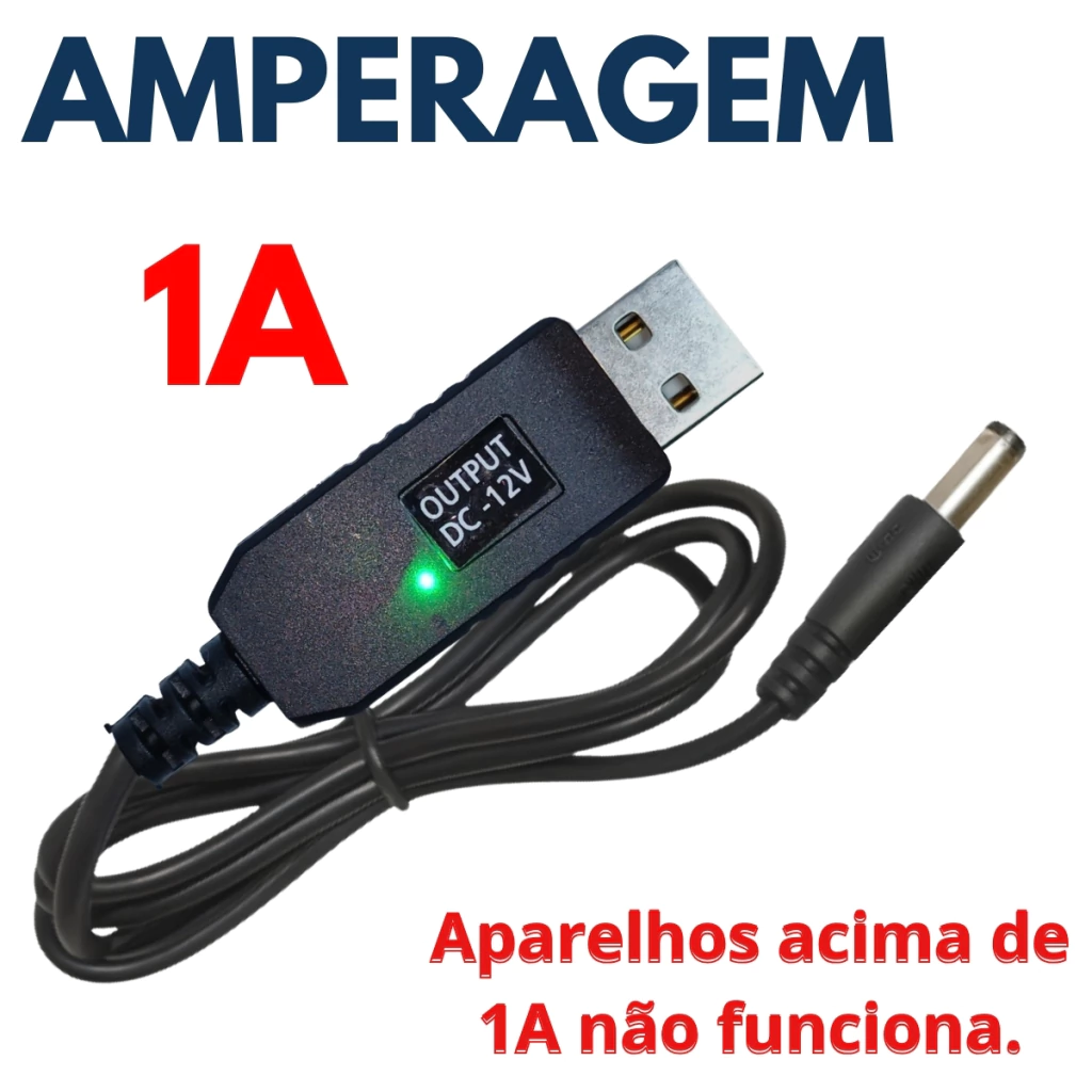 Ele tem uma tensão de entrada de 5V e uma tensão de saída de 12V, com uma corrente máxima de 700mA. O cabo tem um comprimento de 1 metro e um conector p4 de 5.5/2.1 mm.
