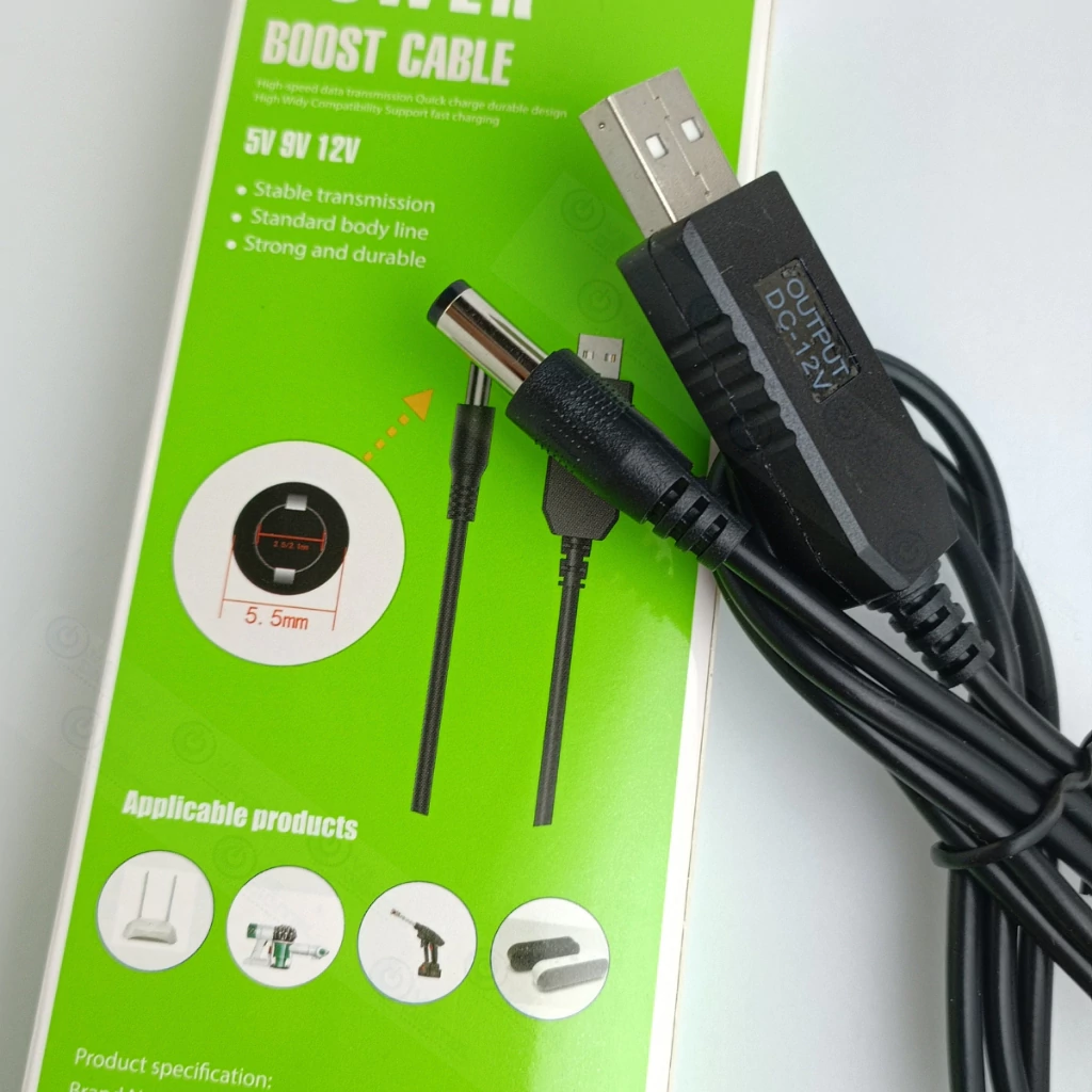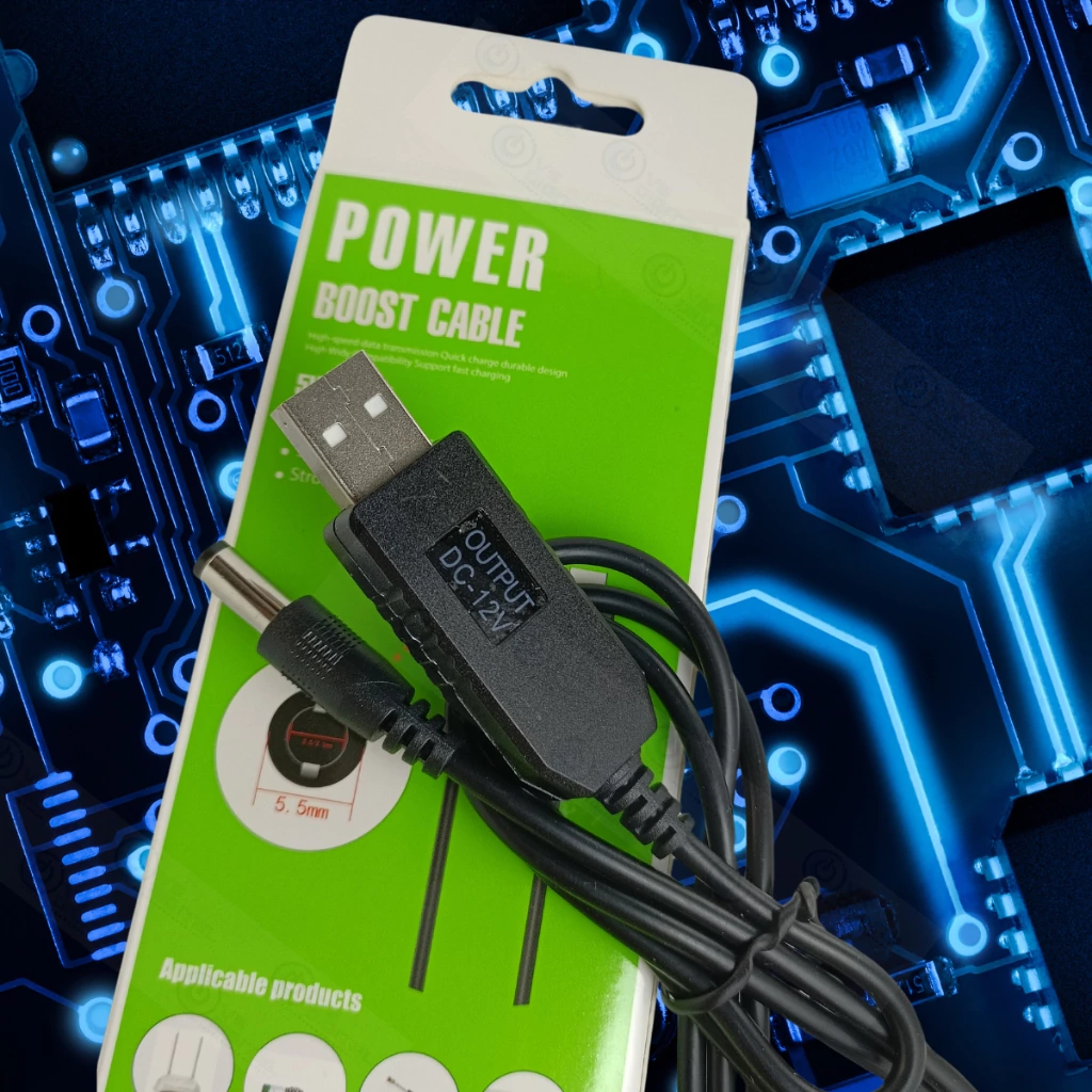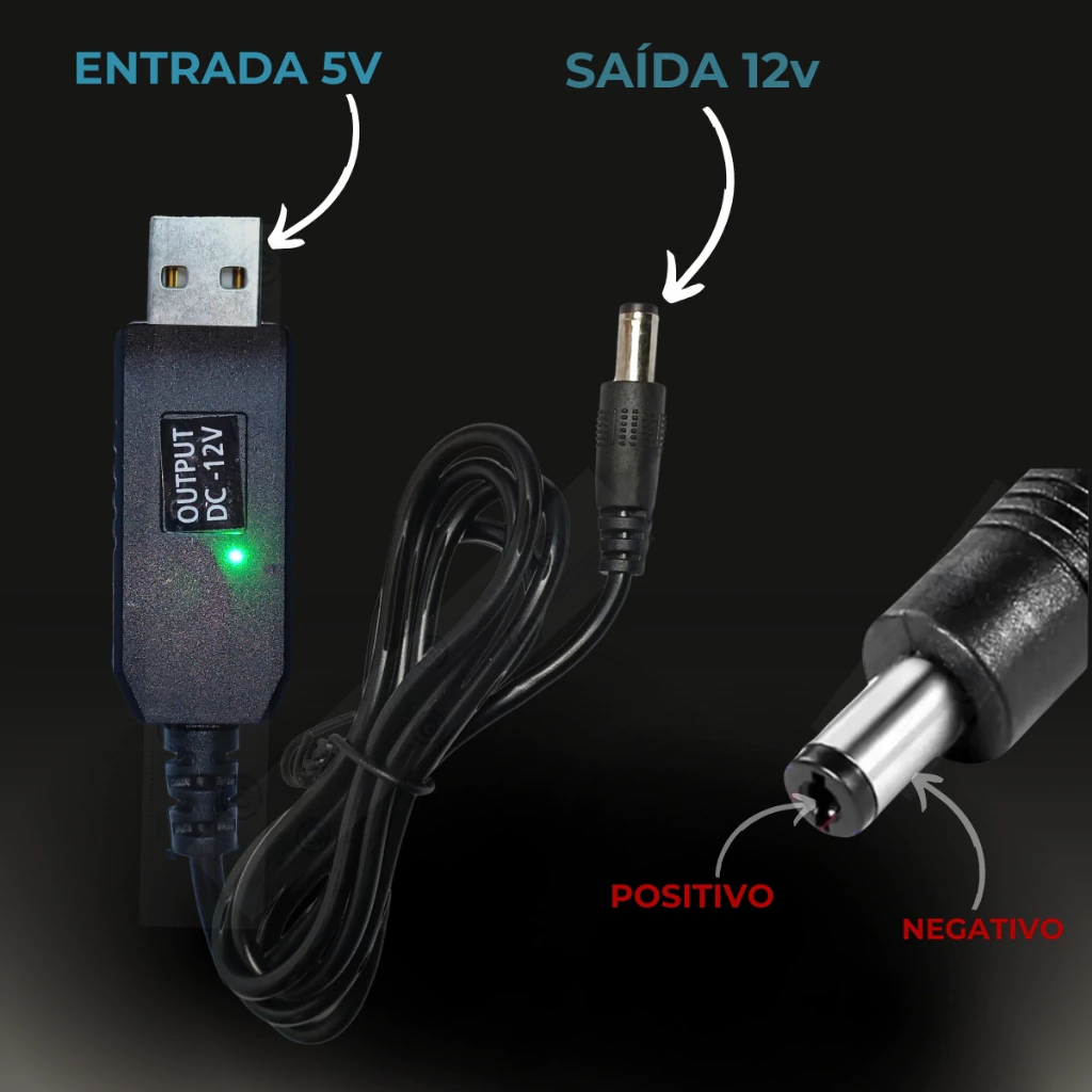 Ele tem uma tensão de entrada de 5V e uma tensão de saída de 12V, com uma corrente máxima de 700mA. O cabo tem um comprimento de 1 metro e um conector p4 de 5.5/2.1 mm.