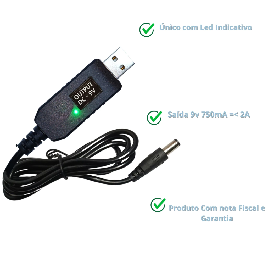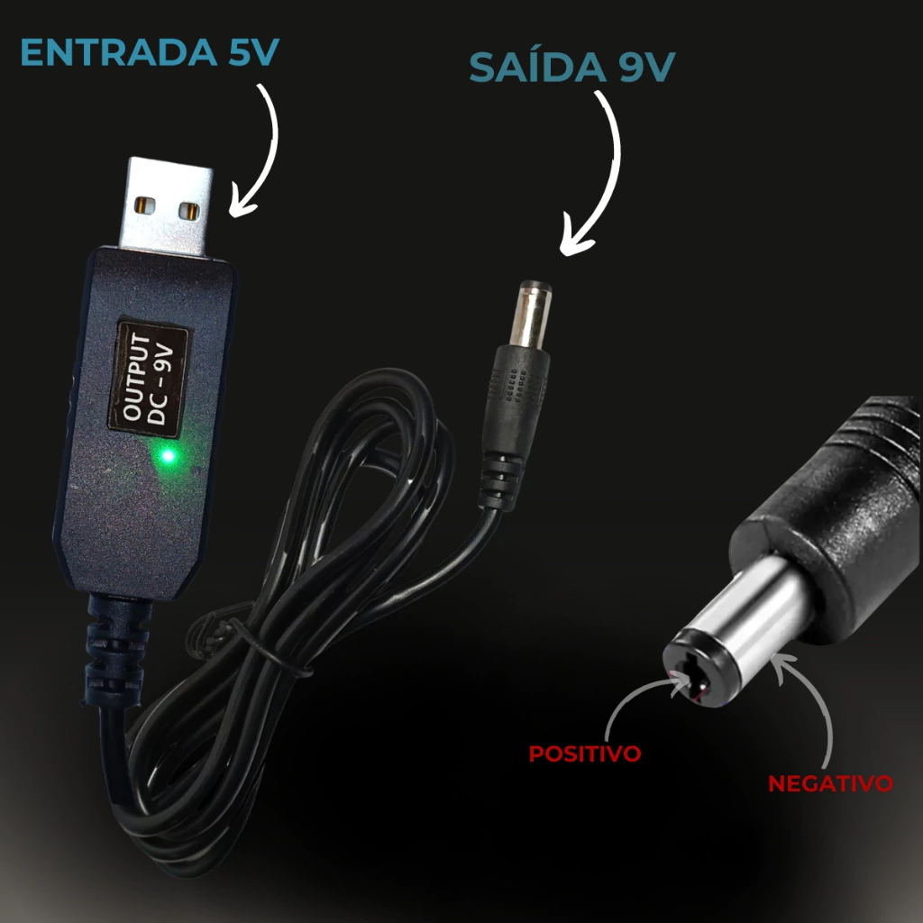 Este conversor USB para plugue p4 permite que você alimente dispositivos que requerem uma tensão de 9V a partir de uma fonte USB de 5V.